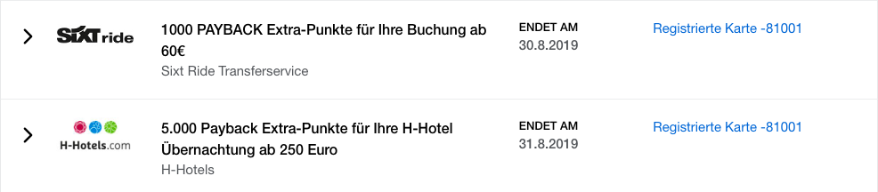 Für die Buchung bei Sixt ride, dem Limousinen Service von Sixt, erhaltet Ihr bei 60 Euro (etwa ein Flughafen Transfer) 1.000 Payback Punkte on Top, wenn Ihr mit der Payback AMEX bezahlt und bei H-Hotels könnt Ihr sogar gleich 5.000 Punkte und damit auch Meilen mitnehmen.