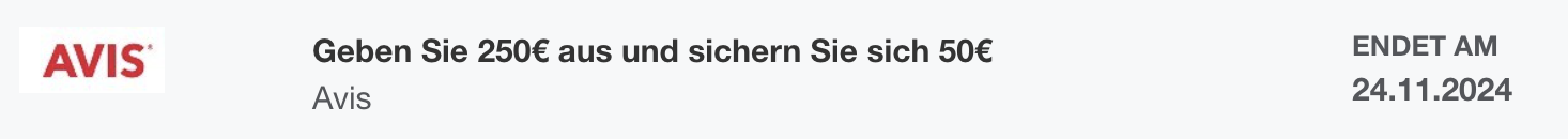 - Aktivieren Sie das Angebot, geben Sie insgesamt bis 24/11/2024 online auf www.avis.de kumulativ mindestens 250€ aus und Sie erhalten einmalig 50€ Gutschrift. Insgesamt maximal 50€ Gutschrift pro registrierte Karte.