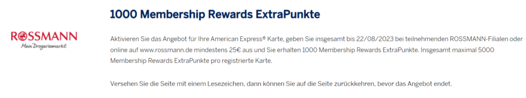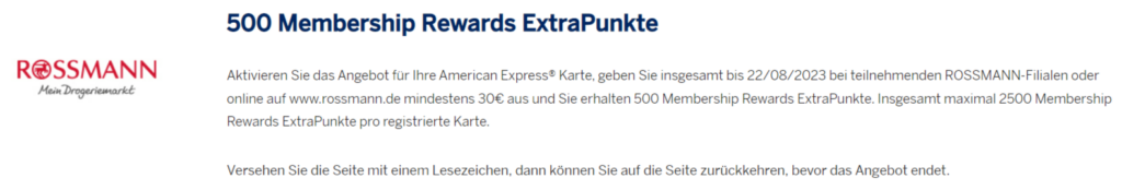 Die neue Woche startet mit einem richtig guten Amex Offer, das für die meisten von Euch nutzbar sein dürfte. Und welches die meisten von Euch auch in dem Amex Offers auf Ihrer American Express Kreditkarte finden dürften oder Ihr Euch alternativ dafür registrieren könnt. Es handelt sich dabei um ein Rossmann-Angebot, bei dem Ihr zusätzliche Membership Rewards Punkte sammeln könnt.
