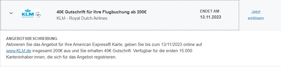 Das Amex Offer von KLM läuft bis zum 13. November 2023. Das ist der Zeitraum, in dem Ihr Euch für die Aktion registrieren könnt und die Belastung der Kreditkarte erfolgen muss. Leider ist das Angebot nicht auf allen American Express Kreditkarten verfübar und wir konnten den Link zur Angebotsseite noch nicht recherchieren. Es lohnt aber auf jeden Fall in Euren Amex Offers nachzuschauen, ob Ihr das Angebot aktivieren könnt.