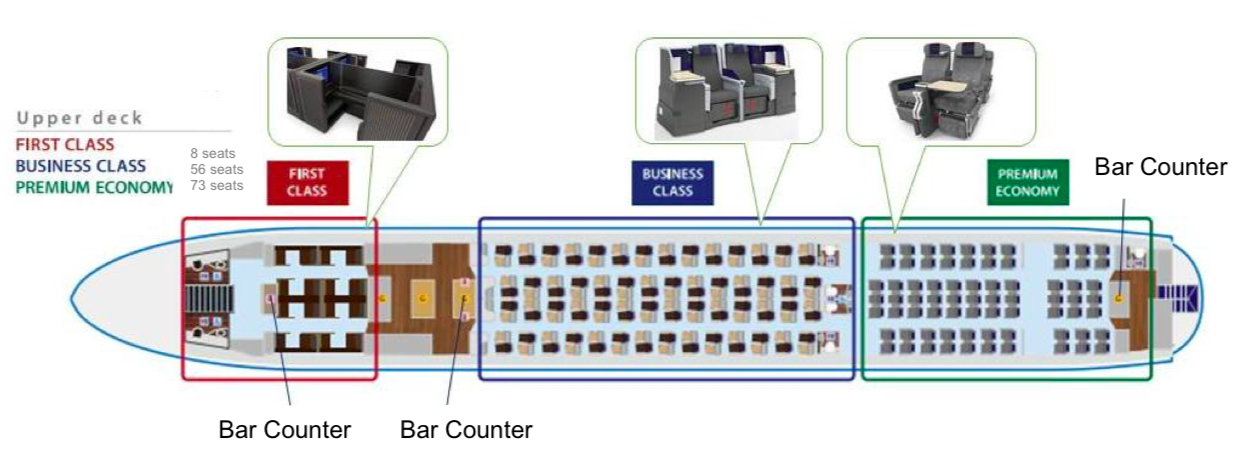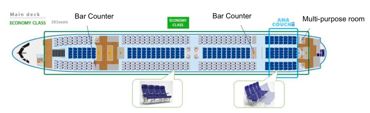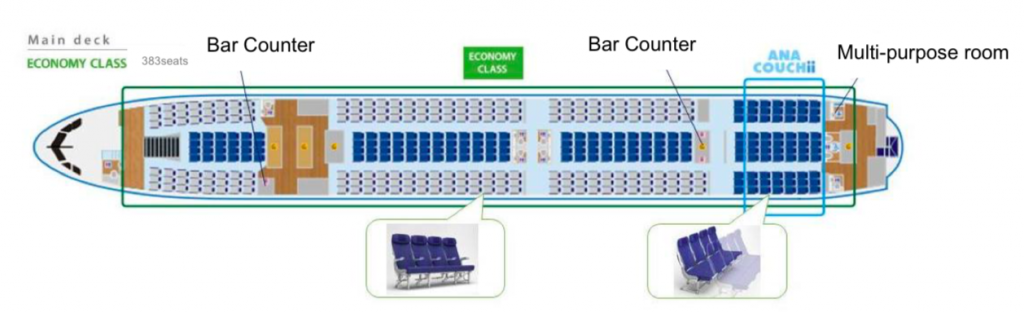 Auch der ANA Airbus A380 wird über alle vier Klassen verfügen und hierbei auf dem gesamten Oberdeck mit Premium Sitzen ausgestattet sein. Bei acht First Class, 56 Business Class, 73 Premium Economy Class und 383 Economy Class Sitzen, zeigt man aber klar, dass der ANA Airbus A380 für ANA Verhältnisse, für den Urlaubermarkt ausgestattet wurde.