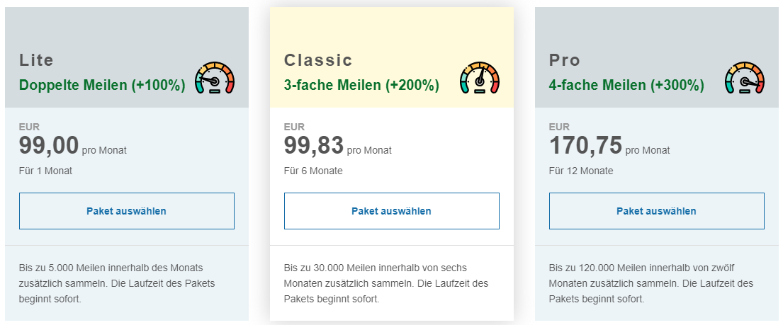 - Classic: 200% (3-fach Meilen) für 99,83 Euro pro Monat bei 6 Monaten Mindestvertragslaufzeit – Limit: 30.000 zusätzliche Meilen innerhalb von 6 Monaten