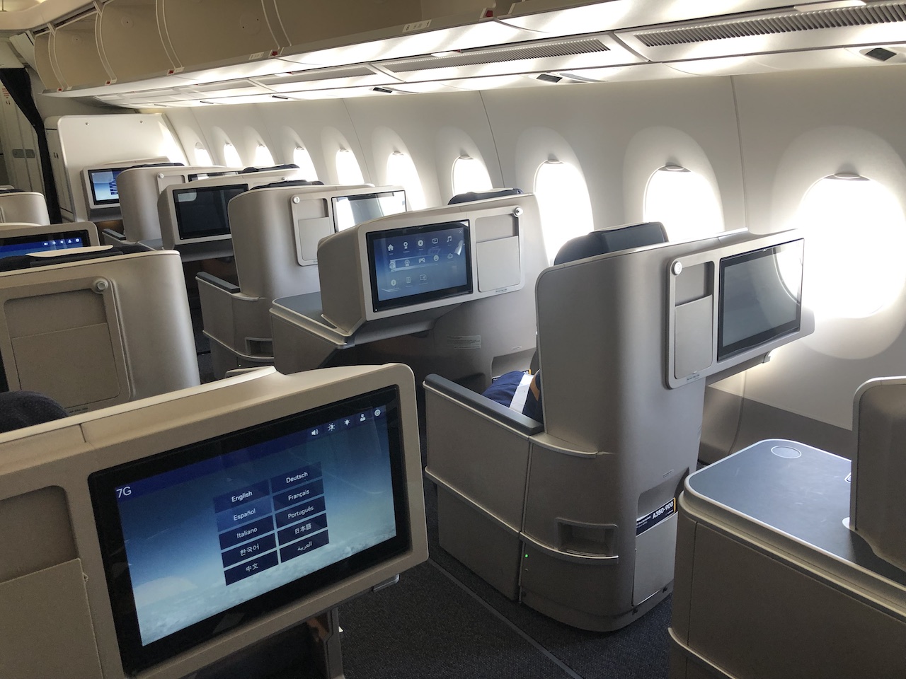 Durch die versetzte 1-2-1 Anordnung hat jeder Passagier auch hier direkten Zugang zum Gang und deutlich mehr Privatsphäre, als in der noch aktuellen Lufthansa Business Class mit einer 2-2-2 Bestuhlung.