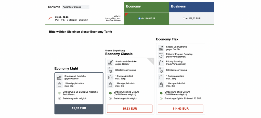 Bei diesen Preisen sind aber auch bei Austrian Airlines kein Aufgabegepäck mehr inklusive und man kauft quasi nur den Flug. Auch an Bord von Austrian Airlines werden in der Economy Class nur noch Essen und Getränke zum Verkauf angeboten. Inklusive ist der Bordservice hier auch nicht mehr.