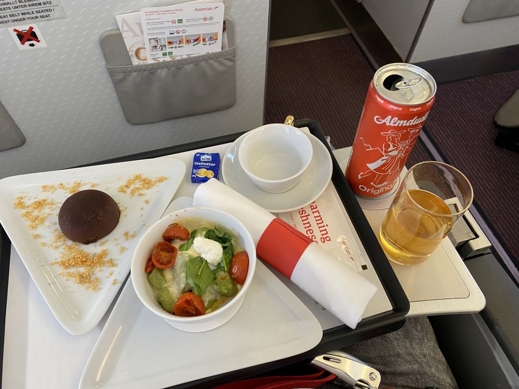 Der Sitz ist insbesondere von den Schlafeigenschaften her sehr gut. Daher kann ich ihn Euch nur wärmstens empfehlen. Auch den Service in der Business Class bei Austrian Airlines kann man als sehr hochwertig bezeichnen. So fliegt auf allen Langstrecken ein Koch mit, welcher das Essen an Bord zubereitet und anrichtet.