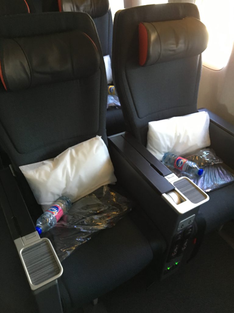 Dabei ist die Austrian Airlines Boeing 767-300 mit 26 Business Class Sitzen in einer 1-2-1 Anordnung und 18 Premium Economy Class Sitzen in einer 2-2-2 Anordnung ausgestattet.