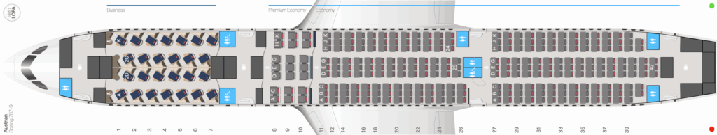 Die Austrian Airlines Boeing 787-9 werden damit weiterhin 26 Business-Class-Sitze in einer 1-2-1-Anordnung, 21 Premium-Economy-Class-Sitze in einer 2-3-2- und 247 Economy-Class-Sitze in einer 3-3-3-Bestuhlung haben.