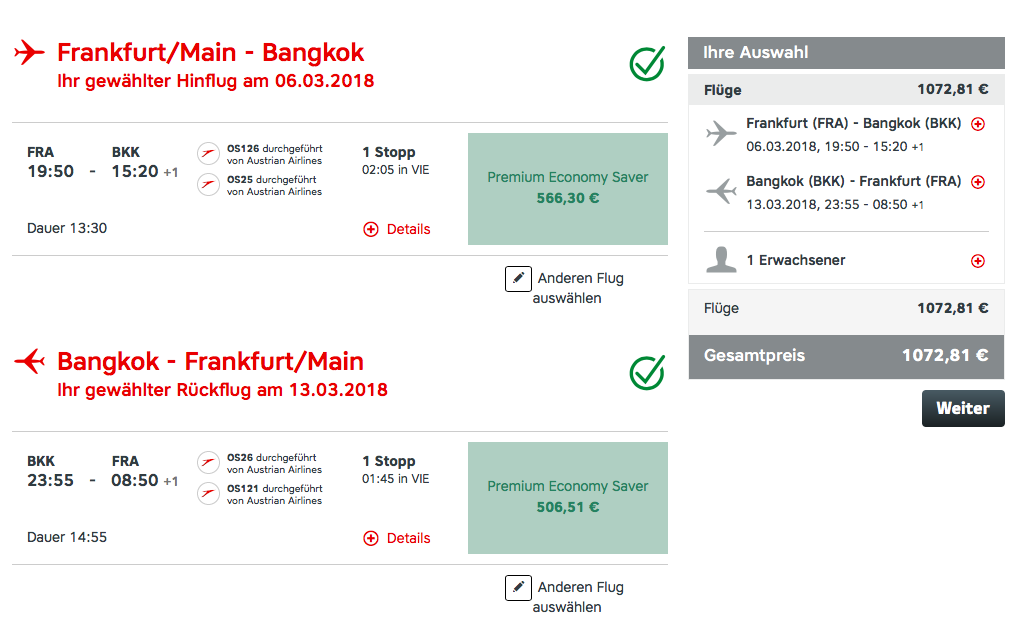 Die Preise könnt Ihr auf Austrian.com einfach ermitteln und buchen.