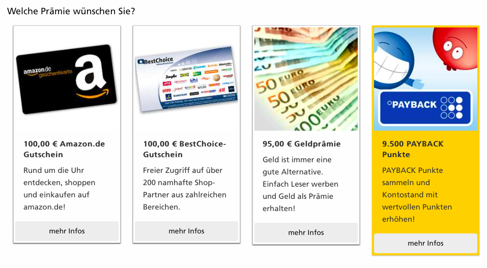 - Der Leserservice hat eine etwas unklare Regelung bezüglich der maximalen Anzahl an Abos: “Aktuell hat der Deutsche Post LESERSERVICE seine attraktiven PAYBACK Angebote auf die haushaltsübliche Menge von 3 Bestellungen pro PAYBACK Karte (Hauptkarte inkl. Nebenkarten) limitiert.“ Wie genau diese Regel ausgelegt wird ist unklar, allerdings gibt es einige Beispiele, bei welchen deutlich mehr als drei Abos auf ein Payback Konto abgeschlossen und auch bestätigt wurden. Wie immer im Leben gilt: Bitte nicht übertreiben!