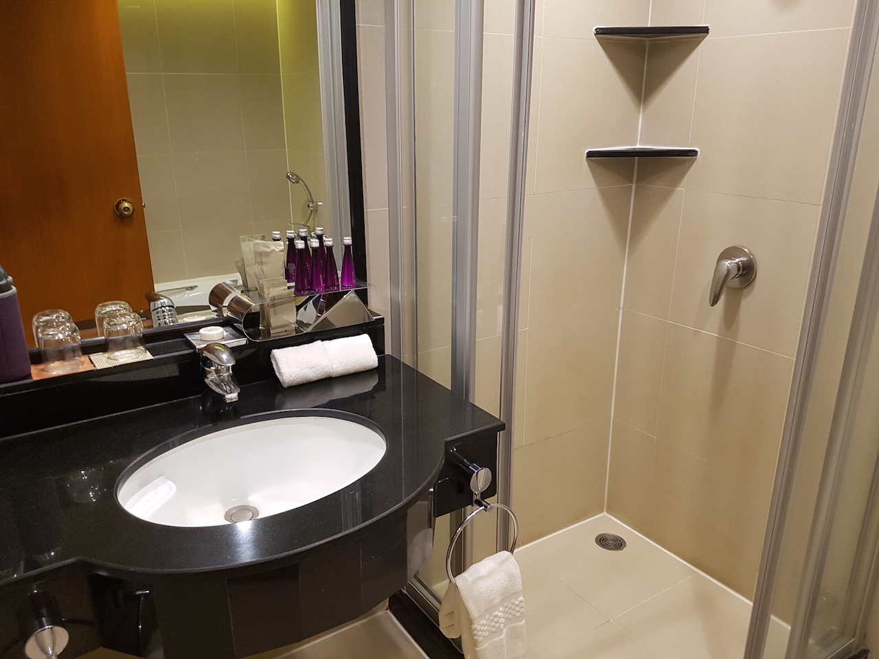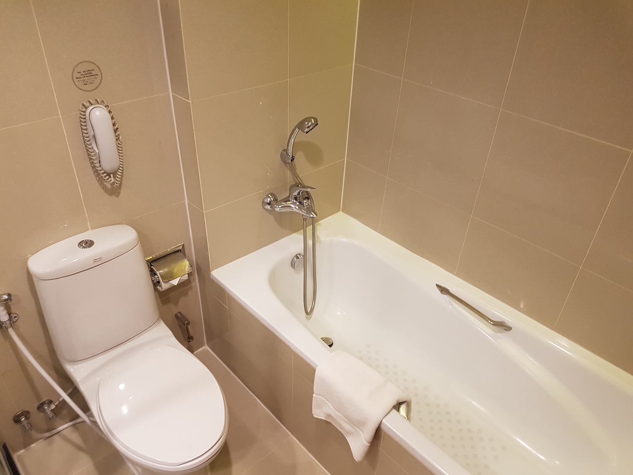 Das Zimmer ist zwar recht groß, allerdings ist es nicht besonders ausgestattet. Das Bad befindet sich auf der rechten Seite neben dem Eingang. Neben einem Waschbecken und einer Dusche, befindet sich auch die Toilette im selben Raum. Gegenüberliegend ist auch noch eine Badewanne. Neben dem Waschbecken gibt es ein wenig Ablagefläche. Das Duschgel und die anderen Amenities sind von keiner besonderen Marke.