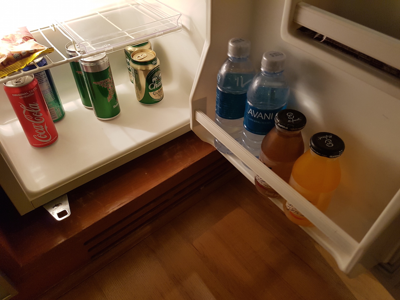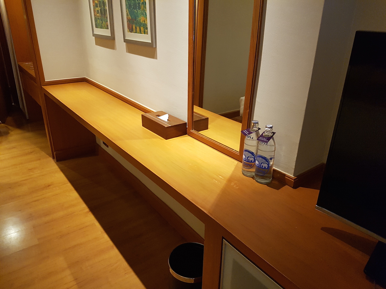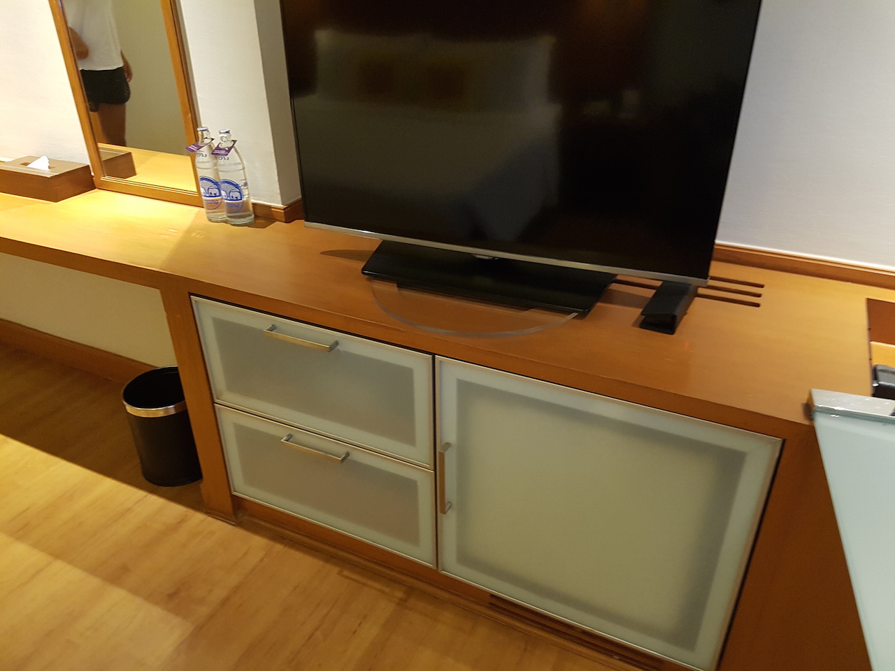 Die Ablage gegenüber vom Bett ist ausreichend groß. Hier gibt es trotz eines Fernsehers noch genügend Platz um andere Dinge abzulegen. Unterhalb des Fernsehers befindet sich die Minibar. Komischerweise sind die Getränke wesentlich teurer als an der hoteleigenen Bar.