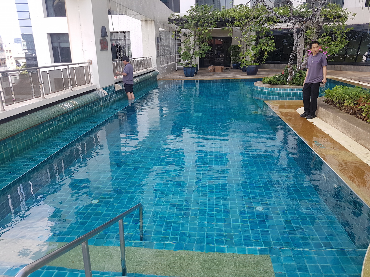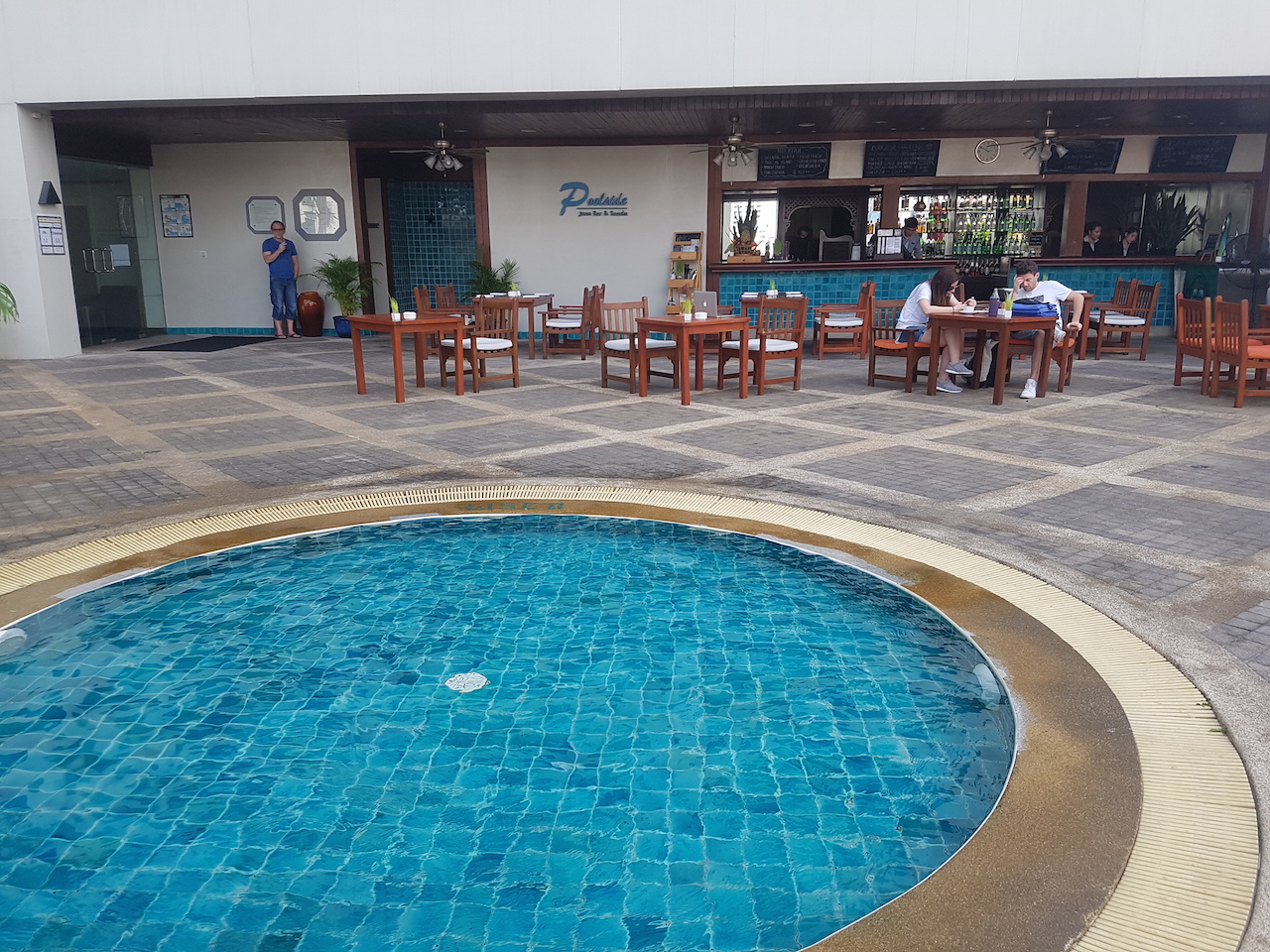Im vierten Stock befindet sich der Pool. Er ist sauber, nicht besonders groß aber ausreichend, wirkt aber in die Jahre gekommen. Die Poolbar ist bis 22.00Uhr geöffnet. Dies ist der einzige Bereich in dem man auch mal draußen sitzen kann. Als wir am ersten Abend noch einen Cocktail trinken wollten, wurde uns allerding kurz vor 22.00 Uhr die Bestellung verweigert. Auch andere Gäste hätten noch gerne etwas bestellt.