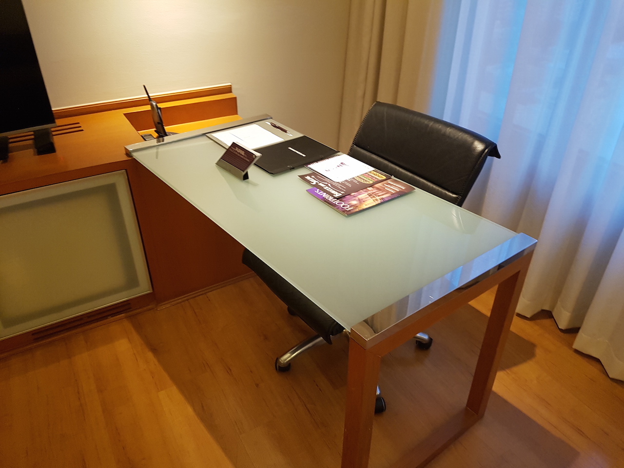 Gegenüber steht ein Schreibtisch. Ich wundere mich immer, warum die Schreibtischstühle ins Zimmer zeigen und nicht in Richtung Fenster mit tollem Ausblick.