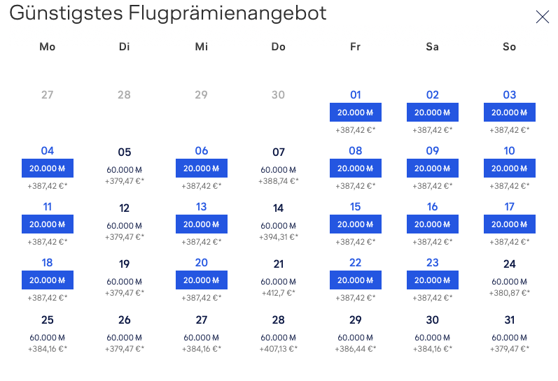 Auch hierbei gilt, dass vor allem Prämienflüge in der Economy Class sehr einfach zu haben sind (auf quasi allen Flügen), aber auch in der Business Class findet man viele verfügbare Daten, nur mit den Uhrzeiten muss man etwas flexibel sein.