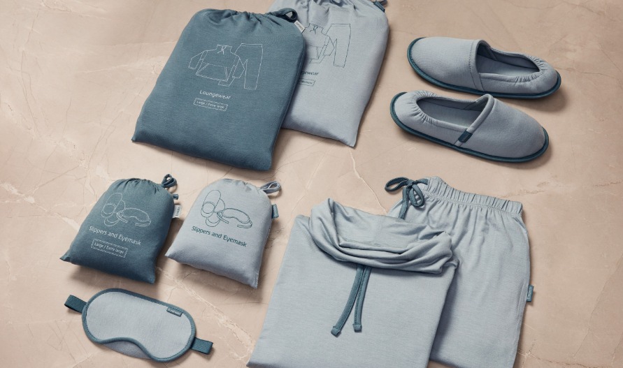 Die volle Ausstattung sollen Passagiere der Business Class auf Flügen von über neun Stunden erhalten. Pyjama, Schuhe und Schlafmaske kommen in einem Beutel mit Kordelzug. Auf Flügen von mindestens zweieinhalb Stunden Flugdauer gibt es zumindest Slipper und Schlafmaske.