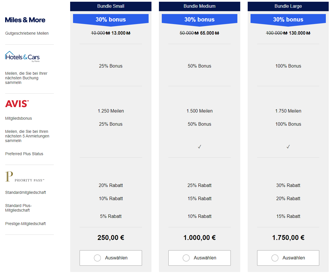 Für diejenigen Leser, die noch nicht mit „Bundle & Go“ vertraut sind, eine kurze Zusammenfassung: Die „Bundle & Go“-Pakete gibt es in drei Größen. Beginnend mit den Bundle Small über das Bundle Medium bis hin zum Bundle Large. Gekauft werden die Meilen bzw. Pakete über den bekannten Vermittler points.com, der auch die Plattform „Hotels & Cars“ betreibt und für viele andere Vielfliegerprogramme und Hotel-Kundenbindungsprogramme den Punktekauf abwickelt.