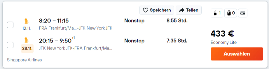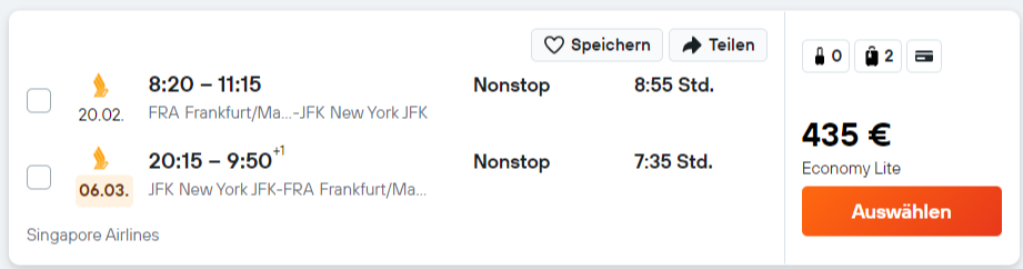 Meine erste Reise in die USA ging damals genau mit diesem Singapore Airlines Flug von Frankfurt. Das Reiseerlebnis habe ich für einen Economy Class-Flug immer noch als herausragend in der Erinnerung. Für mich ist diese Verbindung die beste Möglichkeit nach New York zu fliegen. Zwar haben sich die Angebotspreise seit damals (350 Euro für den Roundtrip) ein Stück weit erhöht und andere Airlines bieten auch günstigere Preis an. Dann jedoch fast immer im Basic-Tarif ohne Gepäck.