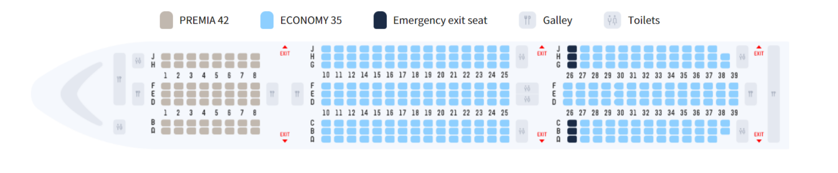 Die Air Premia-Flotte wächst noch um weitere Dreamliner. Die derzeit in Dienst gestellten Flugzeuge verfügen über eine 2-Klassen-Bestuhlung mit 309 Sitzen. Es gibt keine Business oder First Class, dafür jedoch eine Art Premium Economy Class mit einer 2-3-2-Bestuhlung. Hier sitzt Ihr mit 42 Zoll Sitzabstand (107cm) und 20 Zoll Sitzbreite (51cm). In der Economy Class sitzen dann 9 Fluggäste pro Reihe auf Sitzen mit 35 Zoll Abstand (89 cm) und 18 Zoll Breite (46 cm).