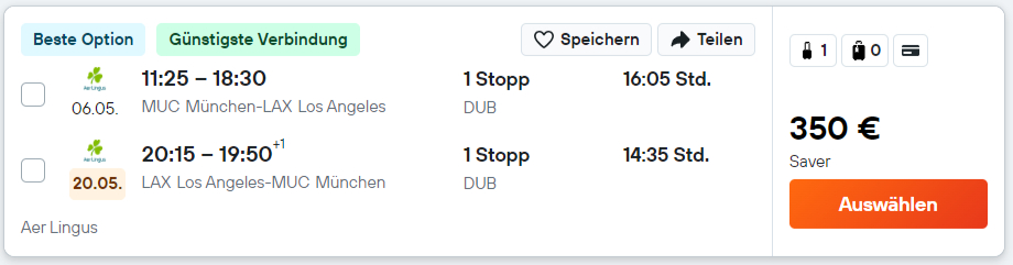 Für 350 Euro geht es mittlerweile nur noch sehr selten an die Westküste der USA. Bei diesem Aer Lingus Economy Class Angebot ist jedoch ein Umstieg in Dublin nötig, um auf diesen Preis zu kommen. Die Reisedauer ist in den meisten Fällen trotzdem sehr human. Auch das Handgepäck kann sich mit 10 Kilogramm zeigen. Da geht schon so Einiges mit, ohne dass ein zusätzliches Gepäckstück gebucht werden muss. Denn das ist bei Aer Lingus Saver Tarif mit einer zusätzlichen Gebühr versehen.
