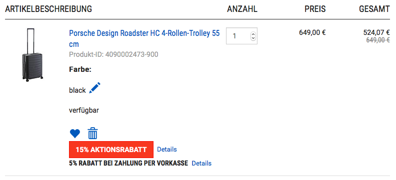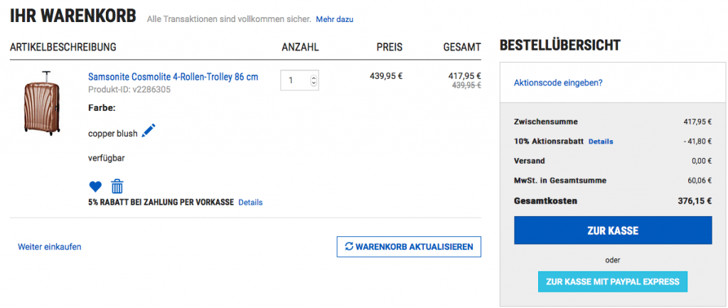 - Mit dem Gutscheincode KOFFERHX48 erhaltet Ihr bis zum 31. Mai noch 15% Rabatt auf alle nicht reduzierten Produkte.