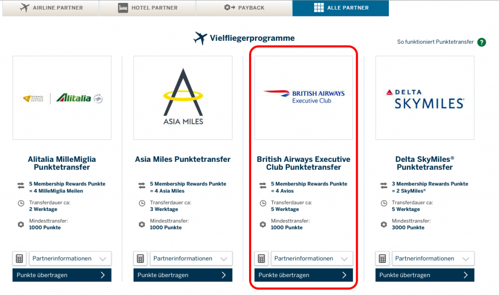 Die mit der AMEX Gold Card gesammelten 20.000 Membership Rewards Punkte lassen sich einfach im Kreditkartenkonto unter Punkteeinlösen > Reisen > Punktetransfer in einem Faktor von 5:4 in British Airways Avios umtauschen. Nach wenigen Tagen erscheinen die Avios auf Eurem British Airways Executive Club Konto und können gegen Freiflüge eingelöst werden.
