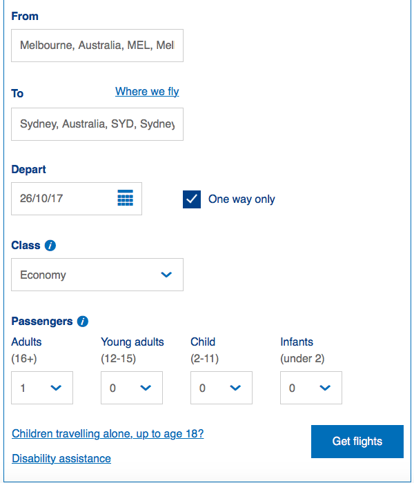 Ab hier wird es sehr intuitiv. Ihr gebt die gesuchte Strecke (im Beispiel Melbourne nach Sydney) und das Datum ein und wählt auf der nächsten Seite Euren Flug aus.