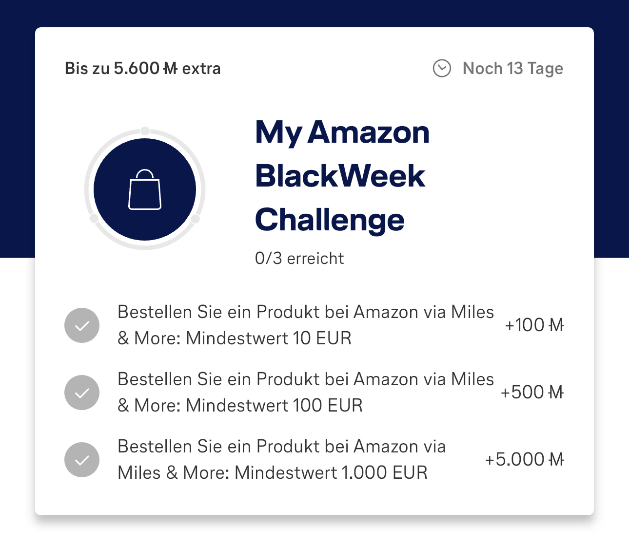 Der Black Friday naht und die (Online-)Händler überfluten uns mit Angeboten. Amazon macht daraus gleich eine oder besser gesagt zwei BlackWeeks, zusätzlich dazu können einige Miles&More Teilnehmer beim Einkauf noch Meilen abstauben. Die Promo läuft als My Challenge und ist für ausgewählte Mitglieder in der App des Vielfliegerprogramms hinterlegt. So ist es möglich, für mehrere Einkäufe für jeweils einen bestimmten Mindestwert einige Tausend Extra-Meilen zu sammeln.