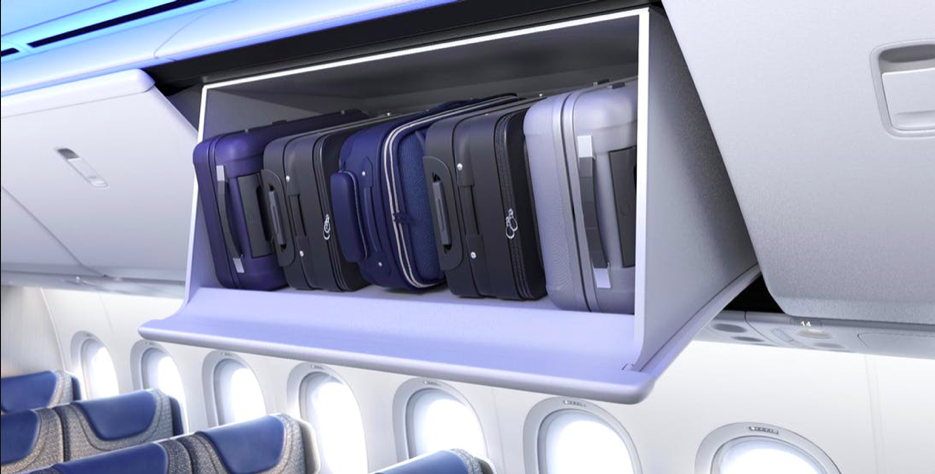 Eine weitere Neuerung wird es auch bei den Gepäckfächern geben, diese hat Boeing für die 777X komplett neu gestalten. So fällt hier auf, dass sie nicht mehr nach außen hin abgerundet sind, wie in der Boeing 777-300er, sondern gerade, was eine „luftigere“ Kabine schaffen soll. Gleichzeitig lassen sich in den neuen Gepäckfächern mehr Handgepäckskoffer verstauen.