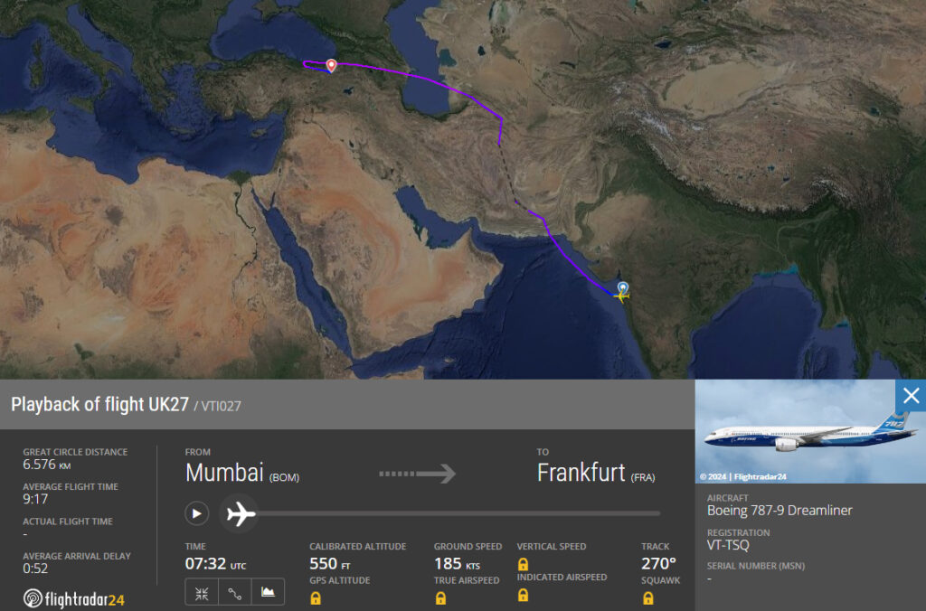 Die indische Fluggesellschaft Vistara bedient in Deutschland nur eine Verbindung. Täglich geht es mit Flug UK27 in etwa neun Stunden von der Metropole Mumbai (BOM) nach Frankfurt (FRA). So war es auch am Freitag, den 6. September 2024, geplant. Doch an diesem Tag erreichte die eingesetzte Boeing 787-9 mit der Registrierung VT-TSQ Frankfurt nicht. Stattdessen landete sie im türkischen Erzurum (ERZ).