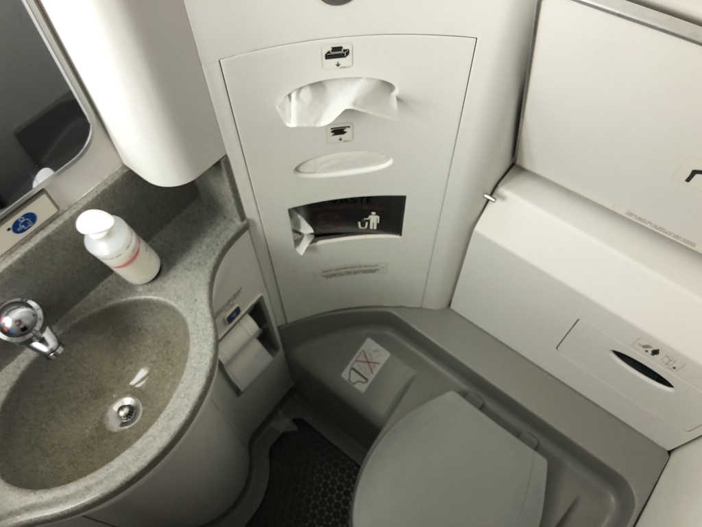 Nach dem Start wurde der Vorhang zwischen den Klassen geschlossen, eine Flugbegleiterin startete unmittelbar den Service in der Economy Class. Dies war gleichzeitig der Zeitpunkt an dem ich feststellte, dass für alle Passagiere nur der hintere Waschraum zur Verfügung stand. Man sollte in diesen Zeiten dann wenn möglich Toilettengänge im Flugzeug vermeiden und nochmal vor dem Boarding das WC im Terminal nutzen.
