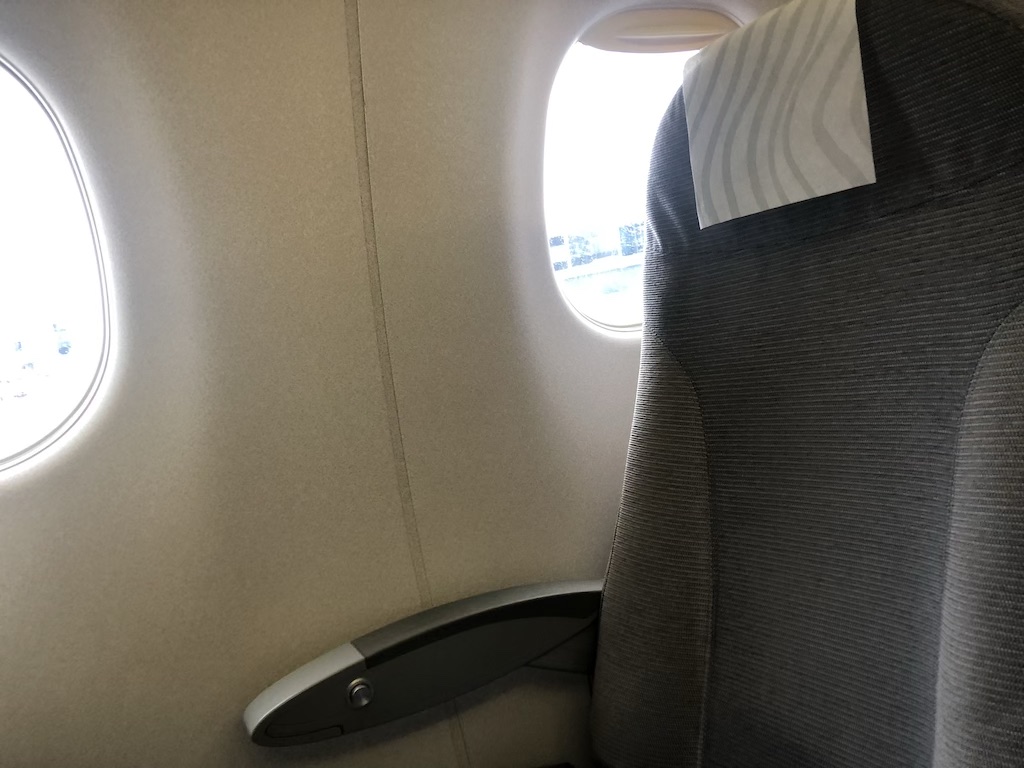 Wie bereits in der Review für den Flug in der Economy Class erwähnt, machte die Maschine nicht mehr den neuesten Eindruck. In Europa ist es gängig, dass die Bestuhlung in beiden Klassen identisch ist. Der Nachbarsitz wird jedoch freigehalten, bei der 2-2 Anordnung in der Embraer bedeutet es also dass jeder Gast ein Sitzpaar für sich hat.