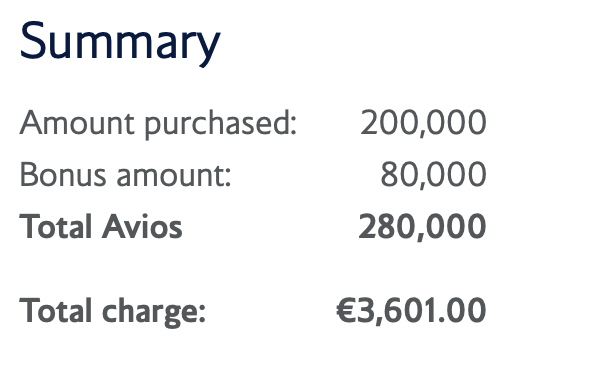 Im Minimum könnt ihr bei diesem Angebot 2.000 Avios kaufen und bekommt 800 weitere Avios als Bonus on top. Nach oben begrenzt ist die Aktion bei 200.000 Avios. Nutzt ihr das Limit, bekommt Ihr 280.000 Avios zum Preis von 3.601 Euro, was 1,3 Cent pro Avios entspricht.
