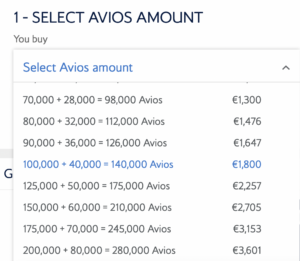 - Wählt aus dem Dropdown-Menü die Menge an Avios aus, die Ihr kaufen wollt (der Bonus und die Gesamtmenge werden direkt angezeigt).