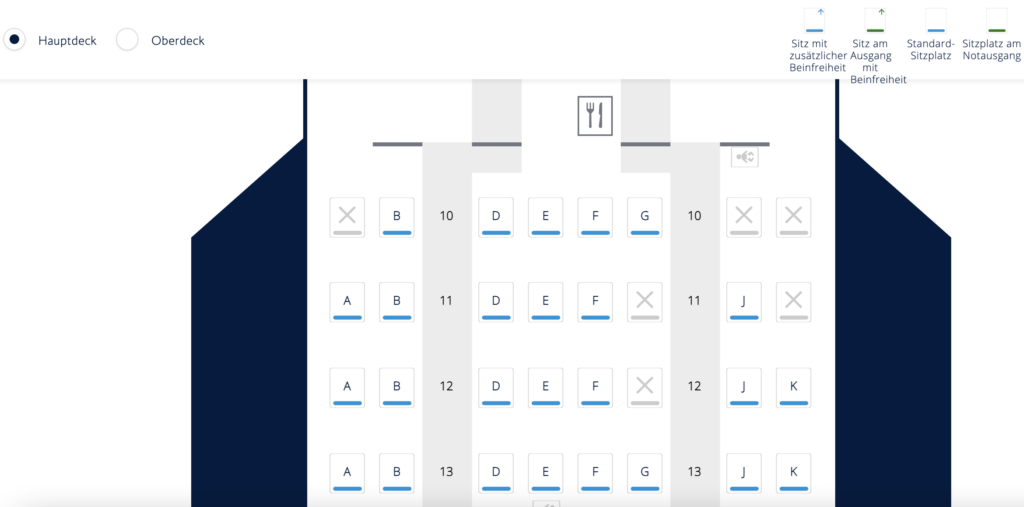 Auf der Reservierungsmaske kann man sich den Wunschsitzplatz aussuchen, dort kann man auch die geblockten Plätze im Oberdeck erkennen. Wir vermuten, dass man die Kapazitäten wohl nicht braucht und so das Ein- und Aussteigen beschleunigt wird. Auch die First Class wird man wohl nicht öffnen, wobei man immer Glück haben kann und hier einen Sitzplatz mit einem Business Class Ticket ergattern könnte.