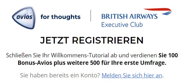 „Avios for thoughts“ ist ein Umfrageportal, bei dem Ihr Prämienmeilen (Avios) für den British Airways Executive Club sammeln könnt. Meldet Ihr Euch jetzt für das Umfrageportal ab und vervollständigt Ihr Euer Profil, erhaltet Ihr 100 Avios völlig kostenlos. 500 weitere Avios sammelt Ihr mit Abschluss der ersten Umfrage. Weitere Avios könnt Ihr mit zusätzlichen Umfragen recht einfach sammeln.
