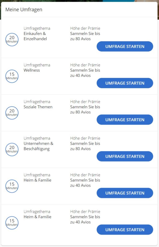 Weitere Avios könnt Ihr anschließend mit Umfragen sammeln. Nachdem ich mein Konto bestätigt hatte, wurden direkt 6 Umfragen freigeschaltet, die mir zwischen 40 und 80 Avios bringen sollen. Der Zeitaufwand ist mit 10 – 20 Minuten je Umfrage bemessen. Das ist schon recht viel Zeit für wenige Avios. Aber wenn das Portal sein Versprechen einhält, gibt es für die erste abgeschlossene Umfrage 500 Avios on top. Und das ist schon einiges mehr, als Ihr für einen günstigen Kurzstreckenflug in der Economy Class sammelt.