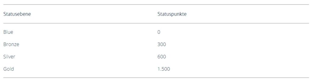 Den Blue-Status als Einstiegsstatus bekommt Ihr natürlich ohne auch nur einen Flug abgeleistet zu haben oder auch nur einen Tier Point gesammelt zu haben. Für die weiteren Status-Stufen müsst ihr allerdings innerhalb Eures Status-Jahres Mindestanforderungen erfüllen.