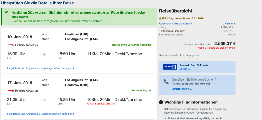 - Einschränkungen: Der Hinflug muss zwischen Dienstag und Samstag stattfinden, der Rückflug ist zwischen Montag und Mittwoch, bzw. Samstag und Sontag möglich.