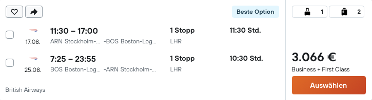 Natürlich muss man für diese günstigen First Class Tickets von British Airways den Umweg über Stockholm in Kauf nehmen allerdings bekommt man dafür auch einen First Class Flug zum Preis eines Business Class Tickets ab Deutschland.