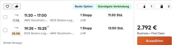 Natürlich muss man für diese günstigen First Class Tickets von British Airways den Umweg über Stockholm in Kauf nehmen allerdings bekommt man dafür auch einen First Class Flug zum Preis eines Business Class Tickets ab Deutschland.