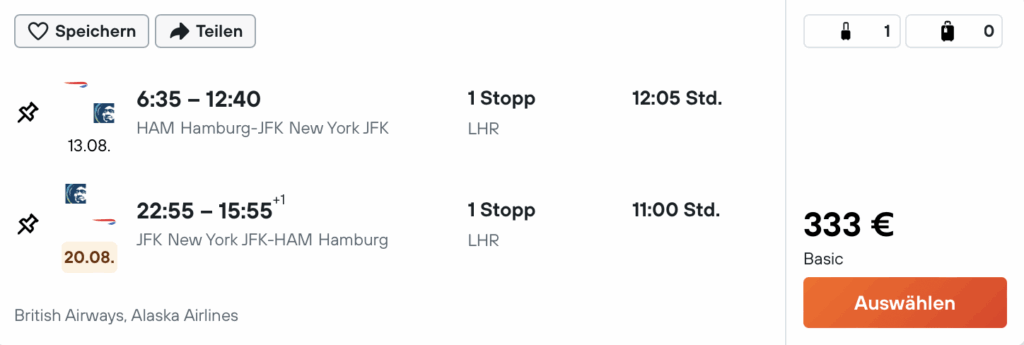 British Airways hat gerade besonders günstige Angebote nach New York im Angebot und bereits ab 333 Euro kann man den Hin- und Rückflug ab vielen Deutschen Städten buchen. Verfügbar sind diese günstigen Preise auch recht kurzfristig im August und man kann so noch diesen Sommer spontan nach New York aufbrechen, aber auch bis März 2026 findet man durchgängig Termine zu diesen Preisen, sodass man auch mit Vorlauf planen kann.