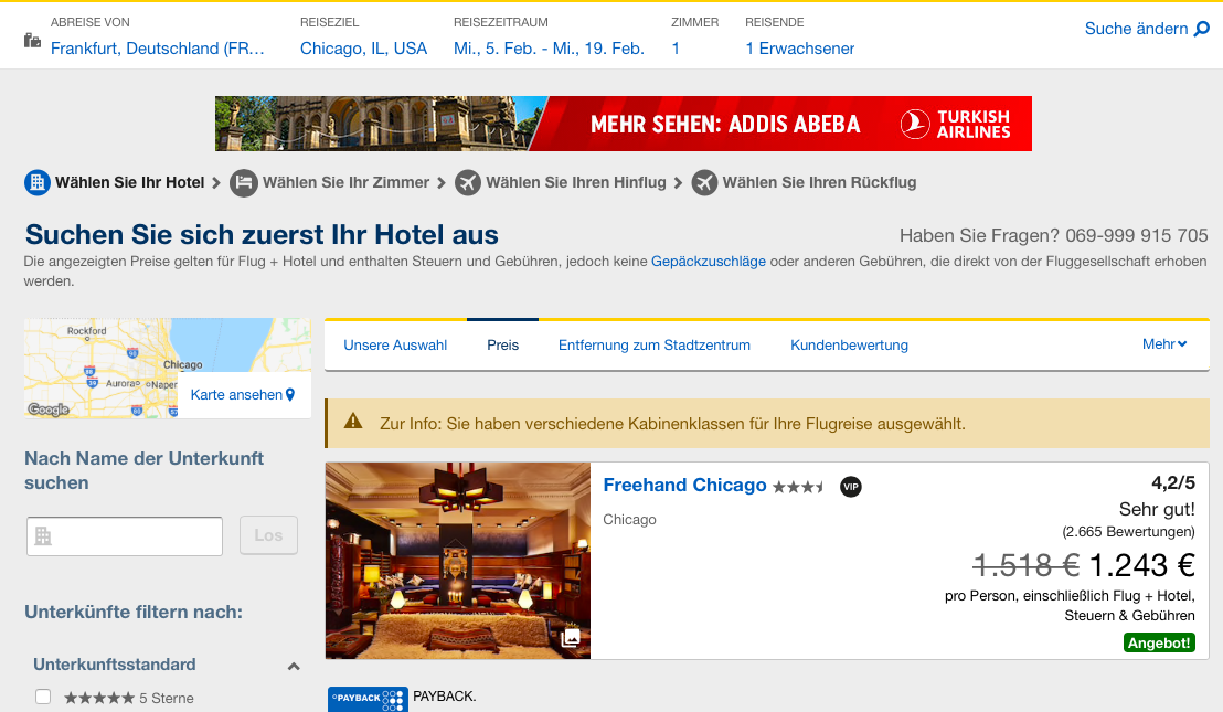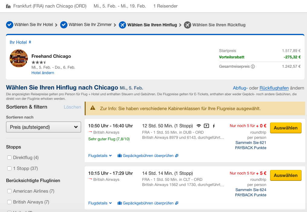 Nach der Auswahl des Hotels, könnt Ihr wie gewohnt Flüge nach Euren wünschen auswählen.