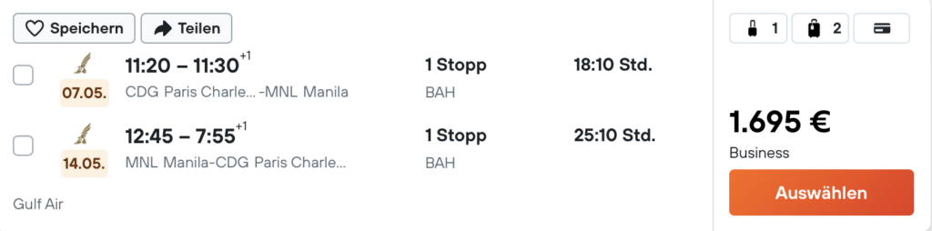Reisen nach Südostasien sind vor allem in der Business Class selten ein Schnäppchen, aber gerade gibt es von Gulf Air sehr attraktive Business Class Tarife ab Paris, mit welchen man die sehr langen Flüge nach Manila auf den Philippinen oder nach Singapur bereits ab 1.695 Euro buchen kann. Verfügbarkeiten lassen sich ab April bis Juni 2025 finden.