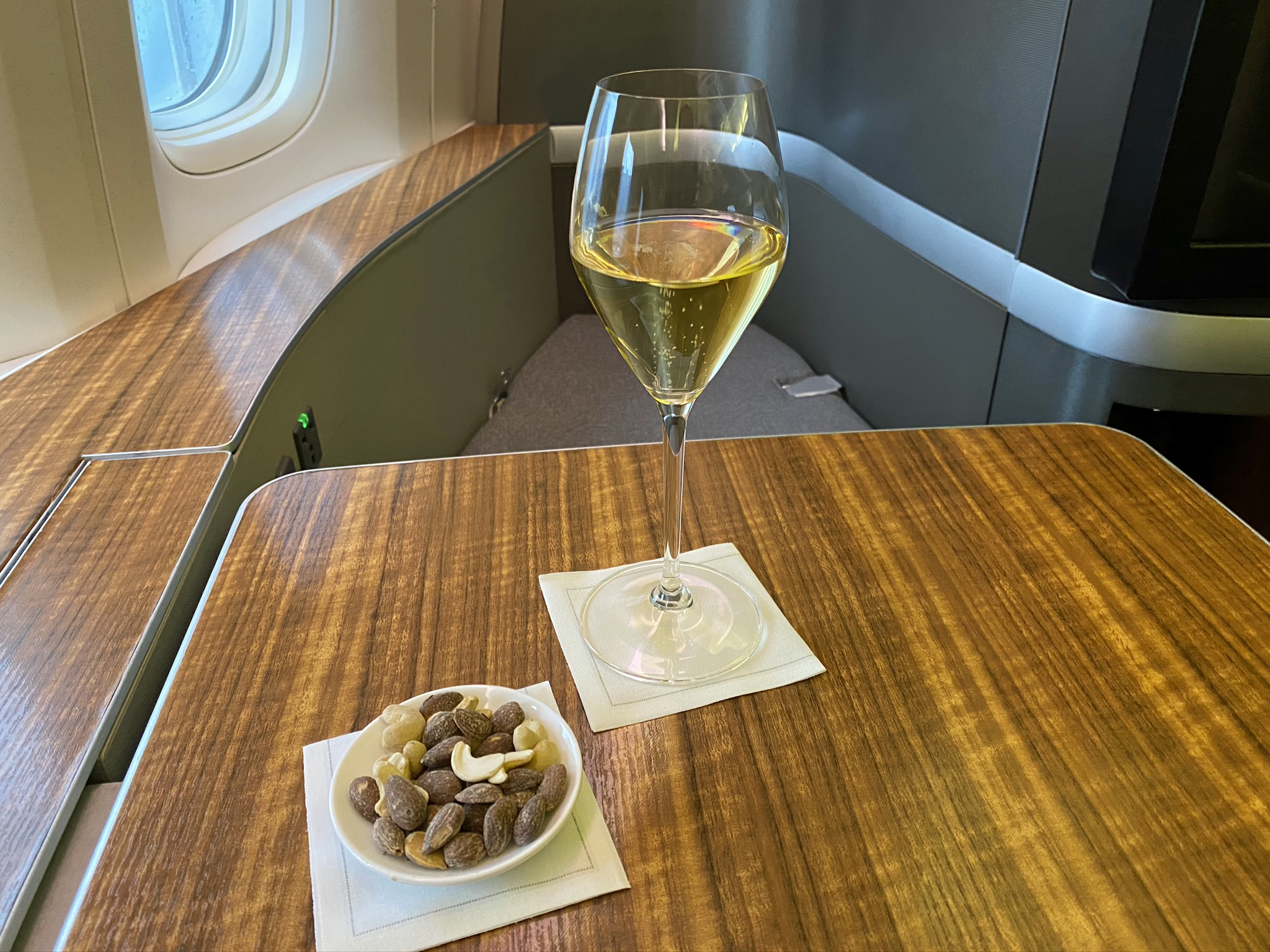Auf meinem Flug war es Krug 2004 (Handelspreis im Moment 350-500€), und auf jeden Fall deutlich mehr als eine Flasche, sowie hervorragende Speisen — für den Report hab ich 11 Gerichte gegessen, und wirklich jeder ganz war sehr gut. Die Weine waren sehr gut, vergleichbar etwa damit, was man bei LH und Swiss bekommt, aber nicht Raritäten wie bei Emirates. Dazu kommt das Bett, das zwar keine Wand/Tut 8 hat, aber unsagbar breit ist. Der breiteste Sitz aller First Classes. Und der Service war perfekt, aber das war immer so bei Cathay.