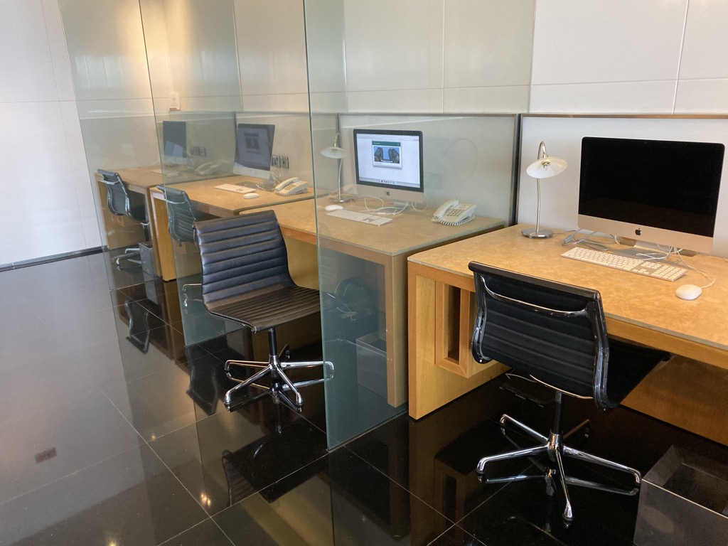 Im hinteren Teil links befand sich ein kleiner Bereich mit PCs, an welchen man arbeiten konnte. An einem Aufsteller konnte man sich an verschiedenen Zeitungen und Magazinen bedienen. Besonders gut hat uns gefallen, dass die Lounge über Tageslicht und Vorfeldblick verfügte. Dies ist in fast jeder Lounge eines unser Highlights, falls vorhanden.
