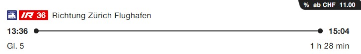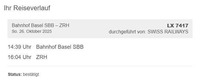 Das sind in der Regel viele Kunden von SWISS, die so ohne umzusteigen im Stundentakt bis zum Flughafenbahnhof in Kloten befördert werden und von dort direkt ihren Weiterflug erreichen. Wenn der Zug denn kommt. Das ist aber seit Anfang August 2025 aufgrund von Bauarbeiten nicht mehr so und soll auch noch bis Oktober so bleiben. Die Info hatten die SBB schon frühzeitig im Januar dieses Jahres kommuniziert.
