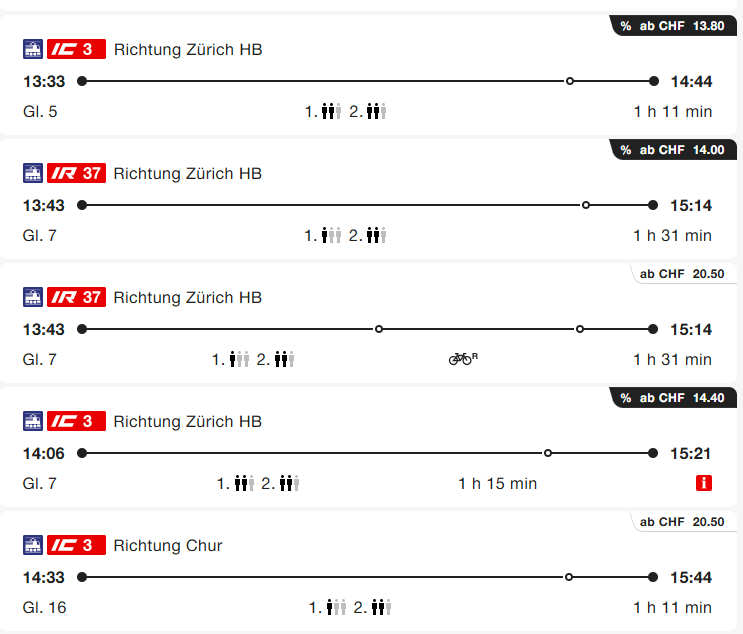 Da ich aber, zumal dann mit dem Zug reisend, mich erstmal im Online Fahrplan schlau machen würde. Und: es wird angesagt dass der Zug nur bis Oerlikon fährt.