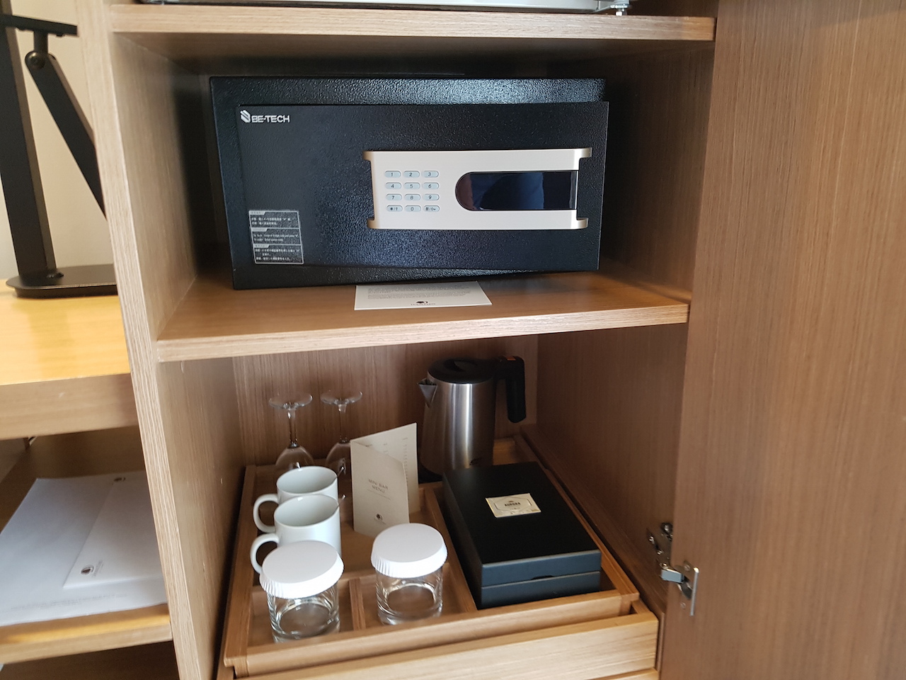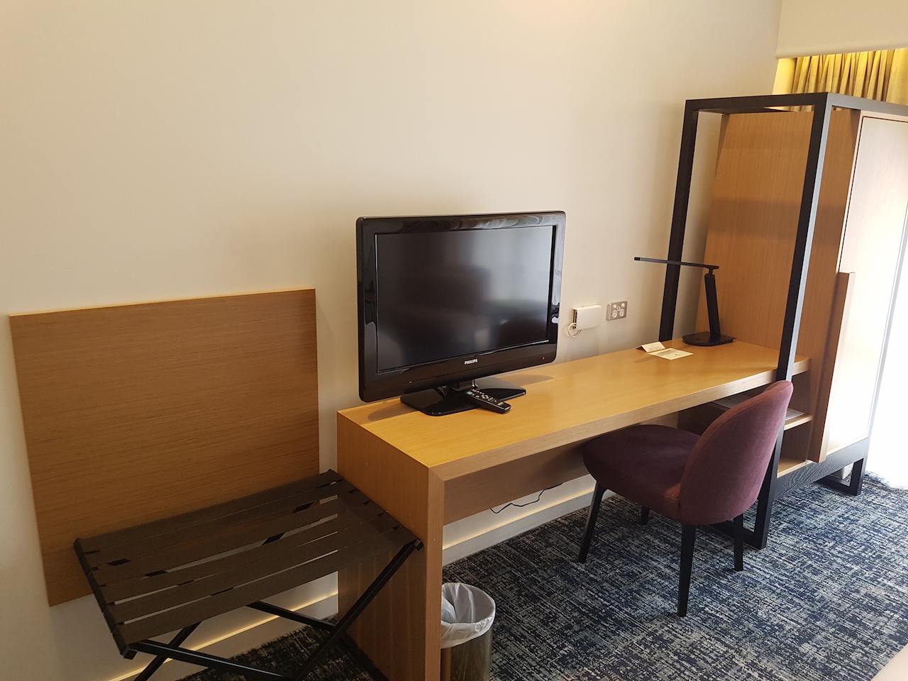Gegenüber vom Bett befindet sich ein Schreibtisch mit Fernseher. Hier lässt sich, wenn nötig, ein wenig arbeiten. Links daneben befindet sich ein Schrank, in den auch der Kühlschrank verbaut war. Leider gab es keine Minibar auf dem Zimmer. Allerdings gab es ein Wasserkocher für Kaffee und Tee. Man muss auch sagen, dass man natürlich jederzeit alles auf das Zimmer bestellen kann. Nur ein paar Flaschen kostenfreies Wasser hätte ich gut gefunden.