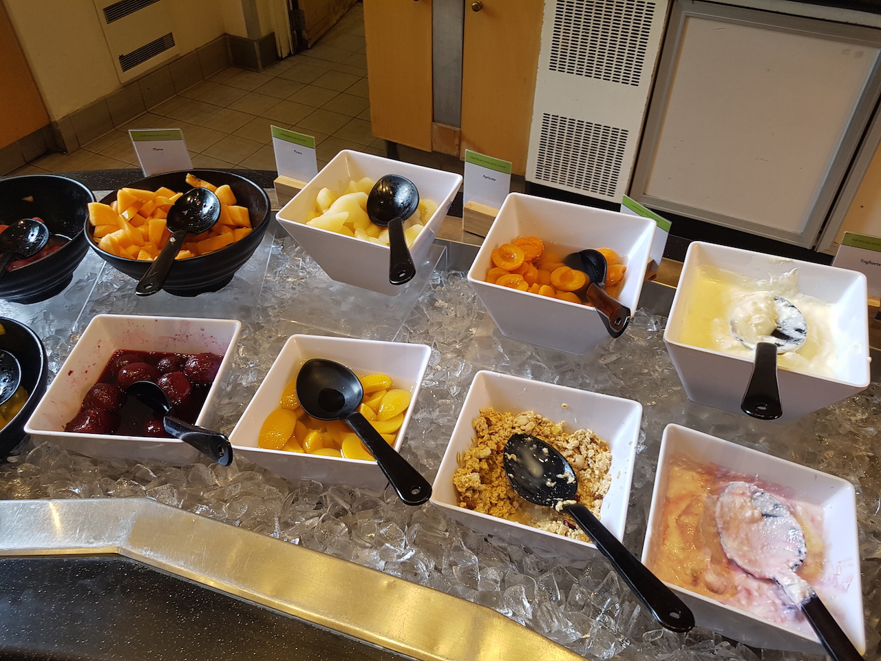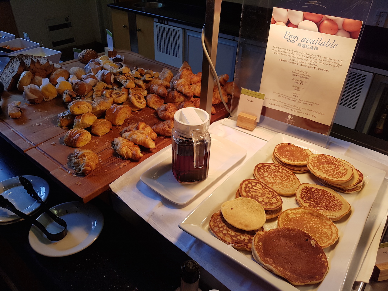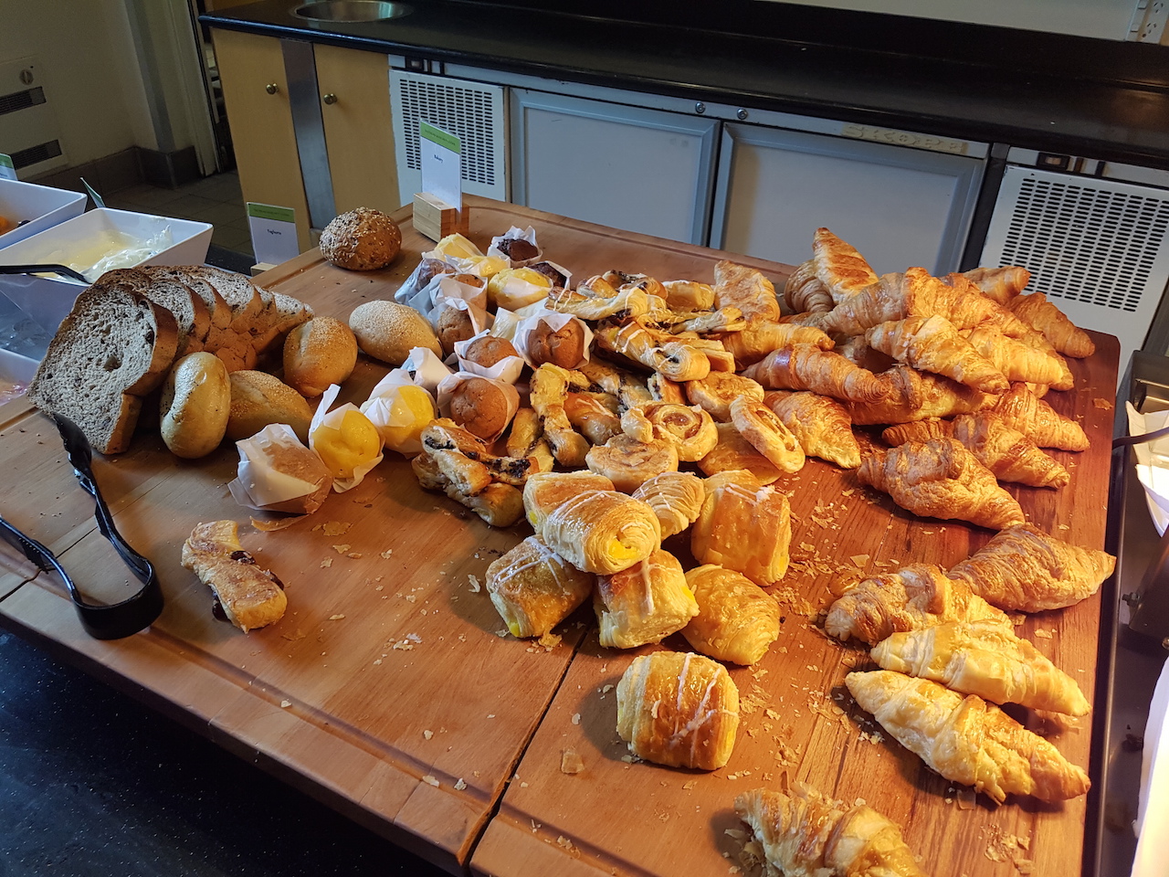 Zudem gab es natürlich auch noch ein Buffet. Hier wurden neben den üblichen warmen Gerichten, wie Rührei mit Speck, auch Hashbrowns, Bohnen und Speck angeboten. Ein typisch englisches Frühstück also. Zudem gab es auch Obst, Müsli, Pancakes und diverse Brötchen, Brote und süße Teilchen.  Die Auswahl des Frühstücks würde ich als gut bewerten. Es wird auch Filterkaffee am Platz serviert. Wenn man allerdings Kaffeespezialitäten wünscht, dann kostet es extra.