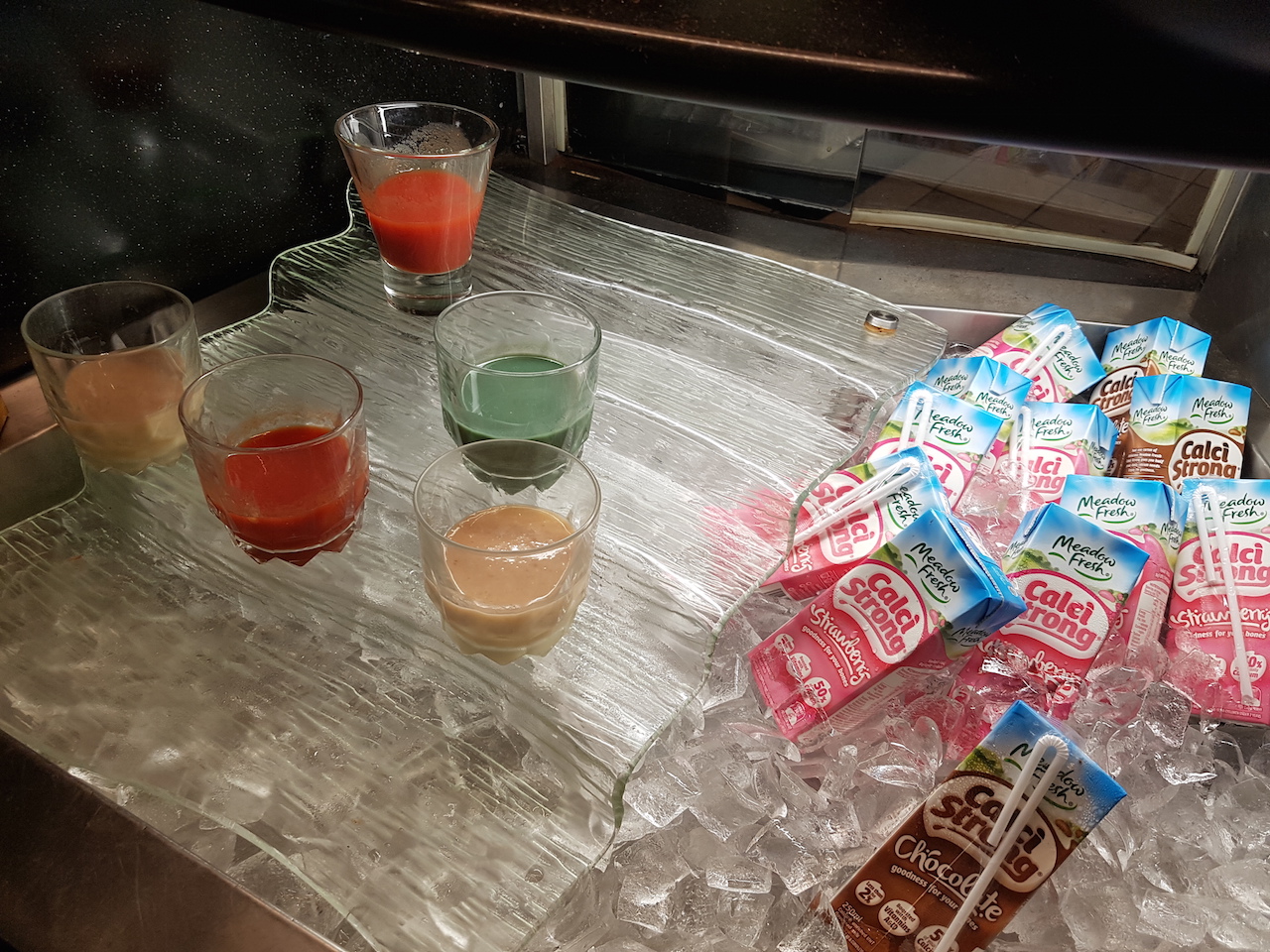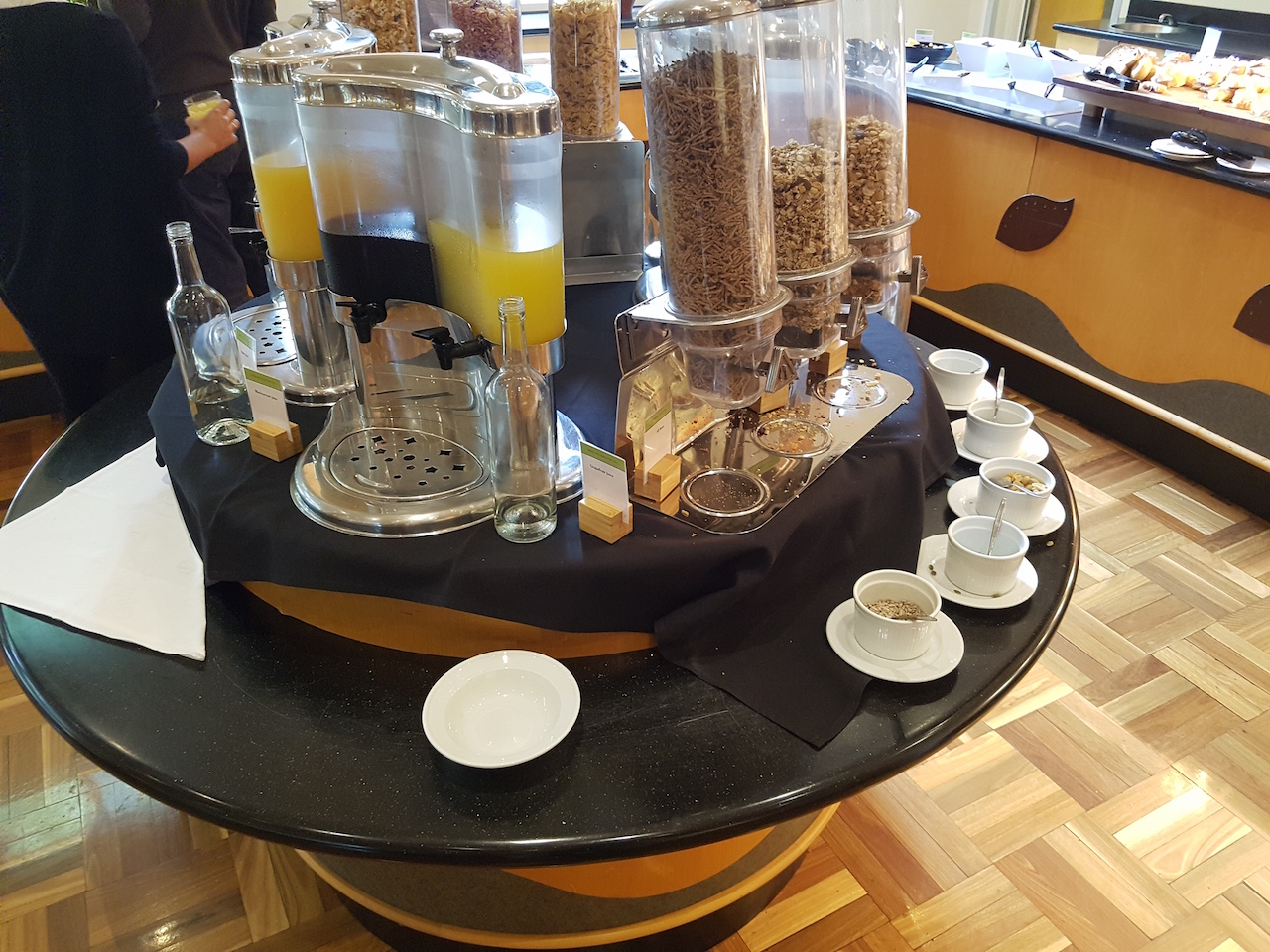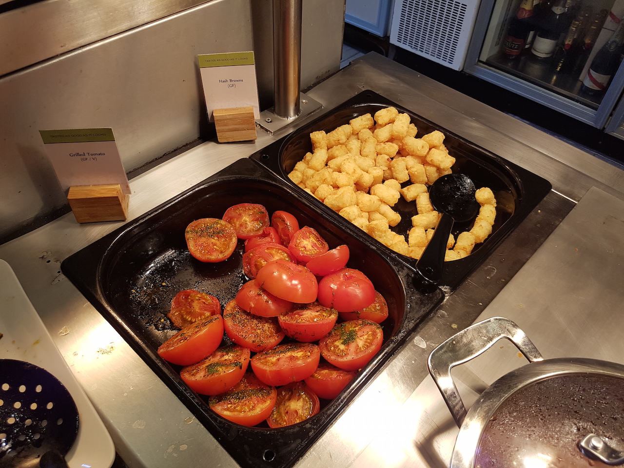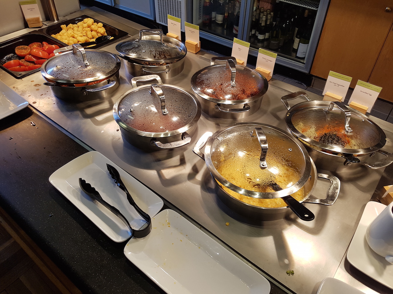 Zudem gab es natürlich auch noch ein Buffet. Hier wurden neben den üblichen warmen Gerichten, wie Rührei mit Speck, auch Hashbrowns, Bohnen und Speck angeboten. Ein typisch englisches Frühstück also. Zudem gab es auch Obst, Müsli, Pancakes und diverse Brötchen, Brote und süße Teilchen.  Die Auswahl des Frühstücks würde ich als gut bewerten. Es wird auch Filterkaffee am Platz serviert. Wenn man allerdings Kaffeespezialitäten wünscht, dann kostet es extra.